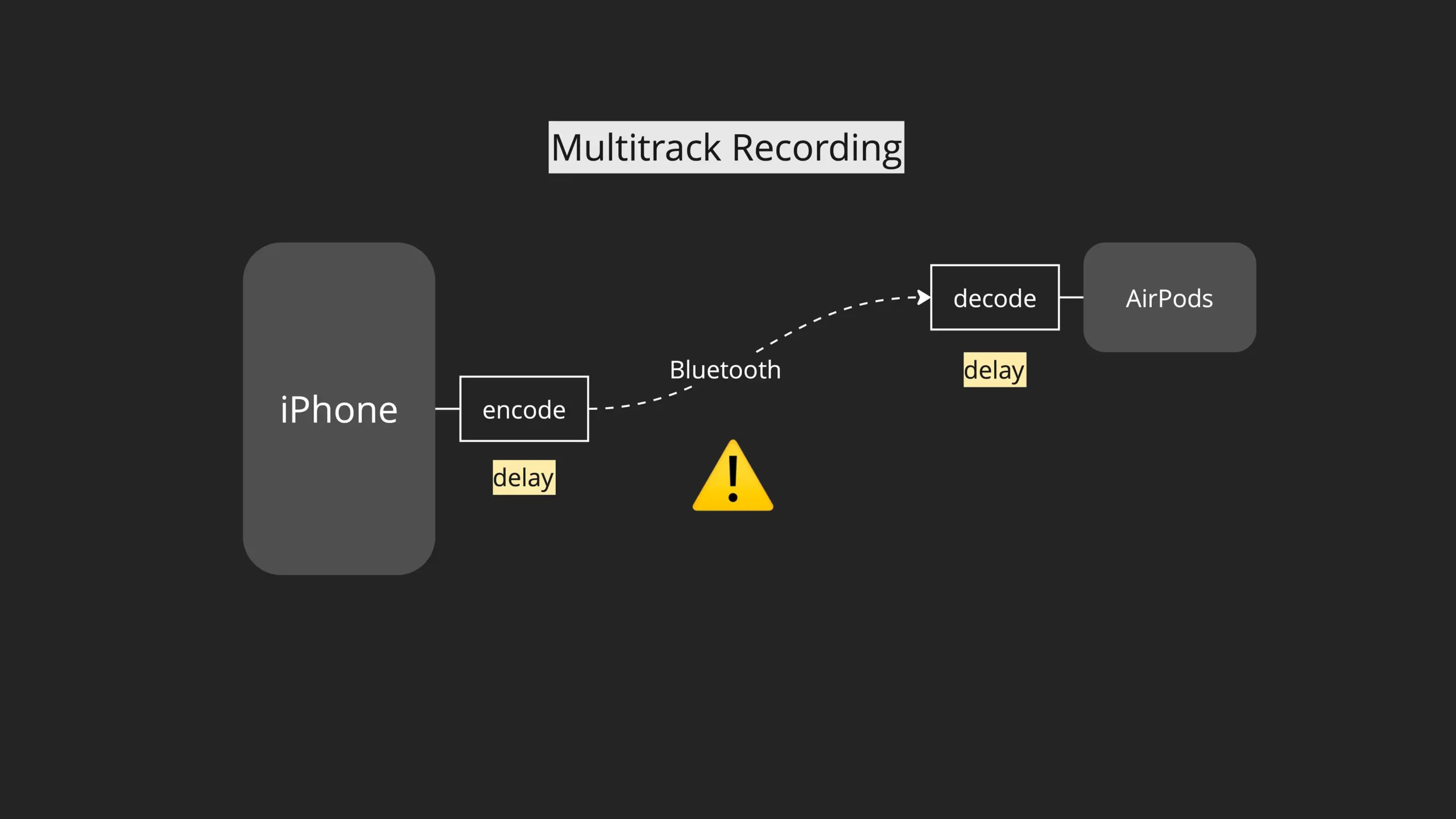 Bluetooth is great for listening back to your recordings on your AirPods or a connected Bluetooth speaker. But, we do not recommend it for recording, because Bluetooth as a technology has a lot of latency. So, what does that mean? It first needs to encode and compress the audio to prepare it for transmission, and then once it receives it, it needs to decompress and decode the audio. All this adds a sizeable delay to the process, and as musicians, we need precise timing when we’re recording multiple tracks. In any case, Bluetooth can’t give us that.