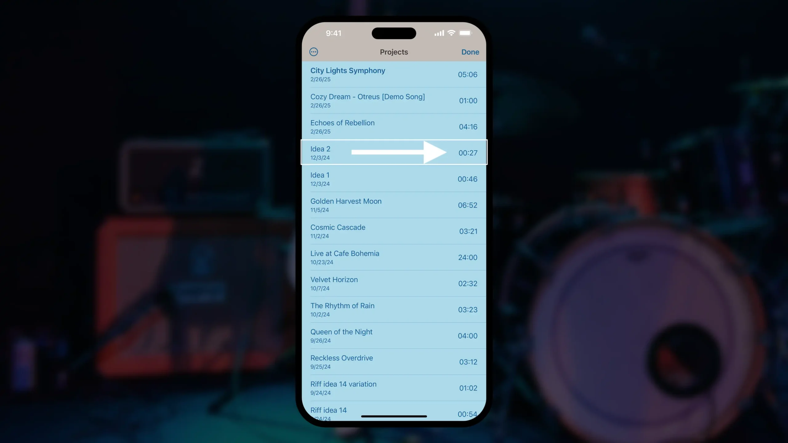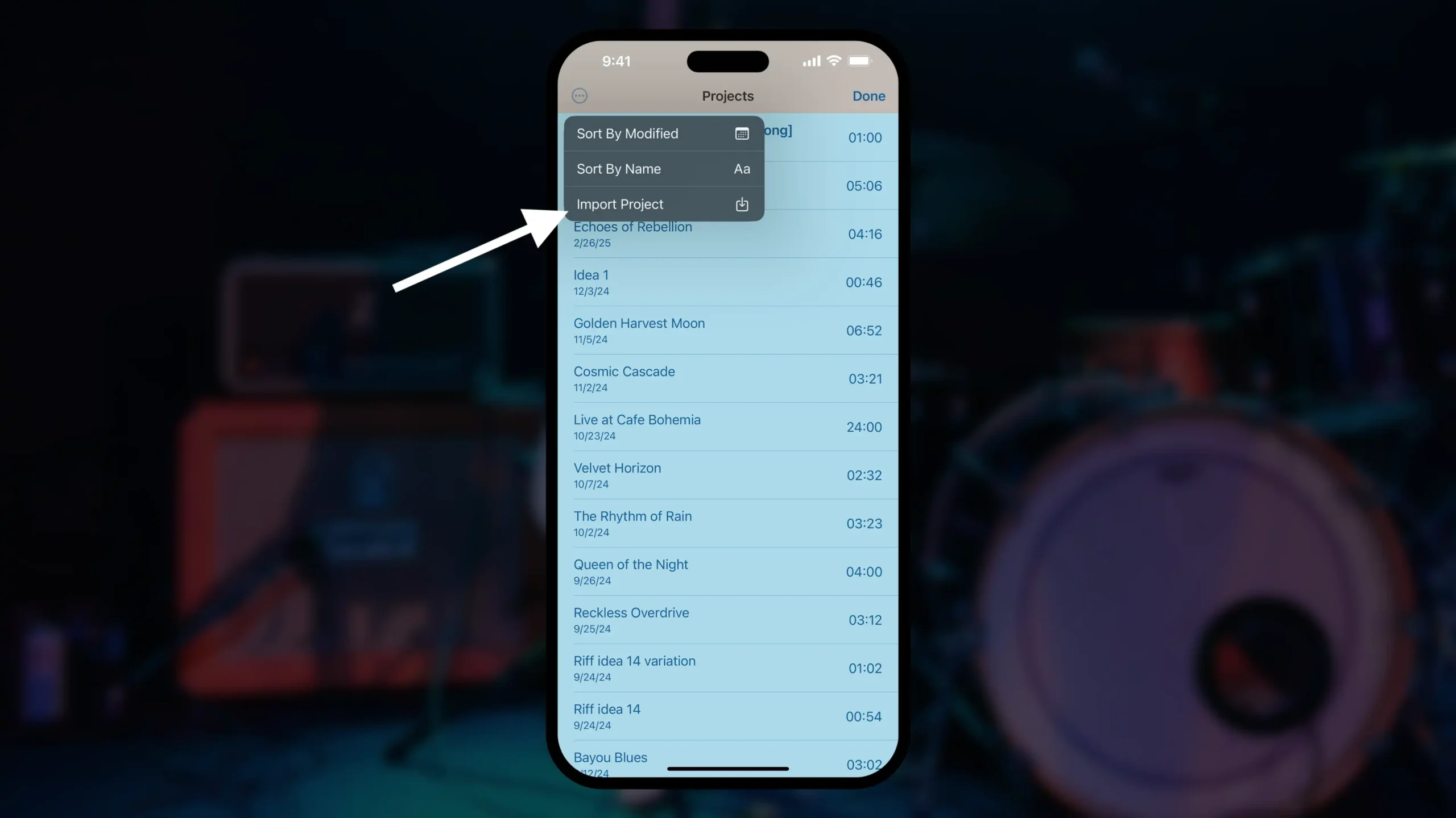 To import a Project back into StudioMini, tap on Projects, More, and Import Project. Then use Apple’s File navigation to locate your StudioMini Project, and select it to have StudioMini bring it in.